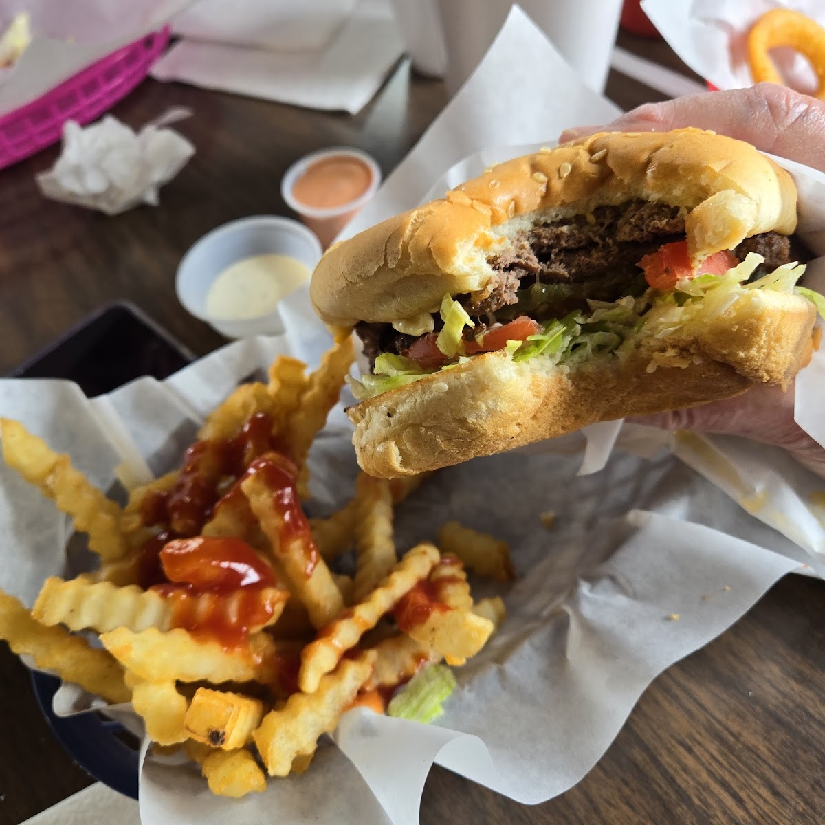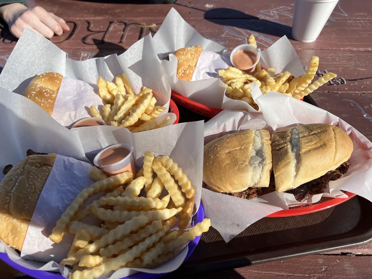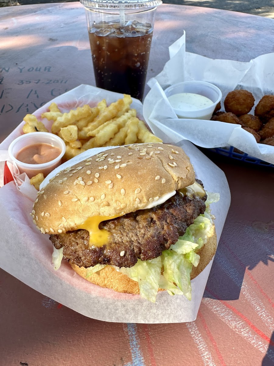 Awesome Boney burger and crinkle cut fries. Just as good as when we ate here as kids, 45 years ago!